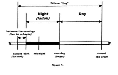 evening (Ex. 12:8) at the going down of the sun (Deut. 16:2,5,6). Unleavened